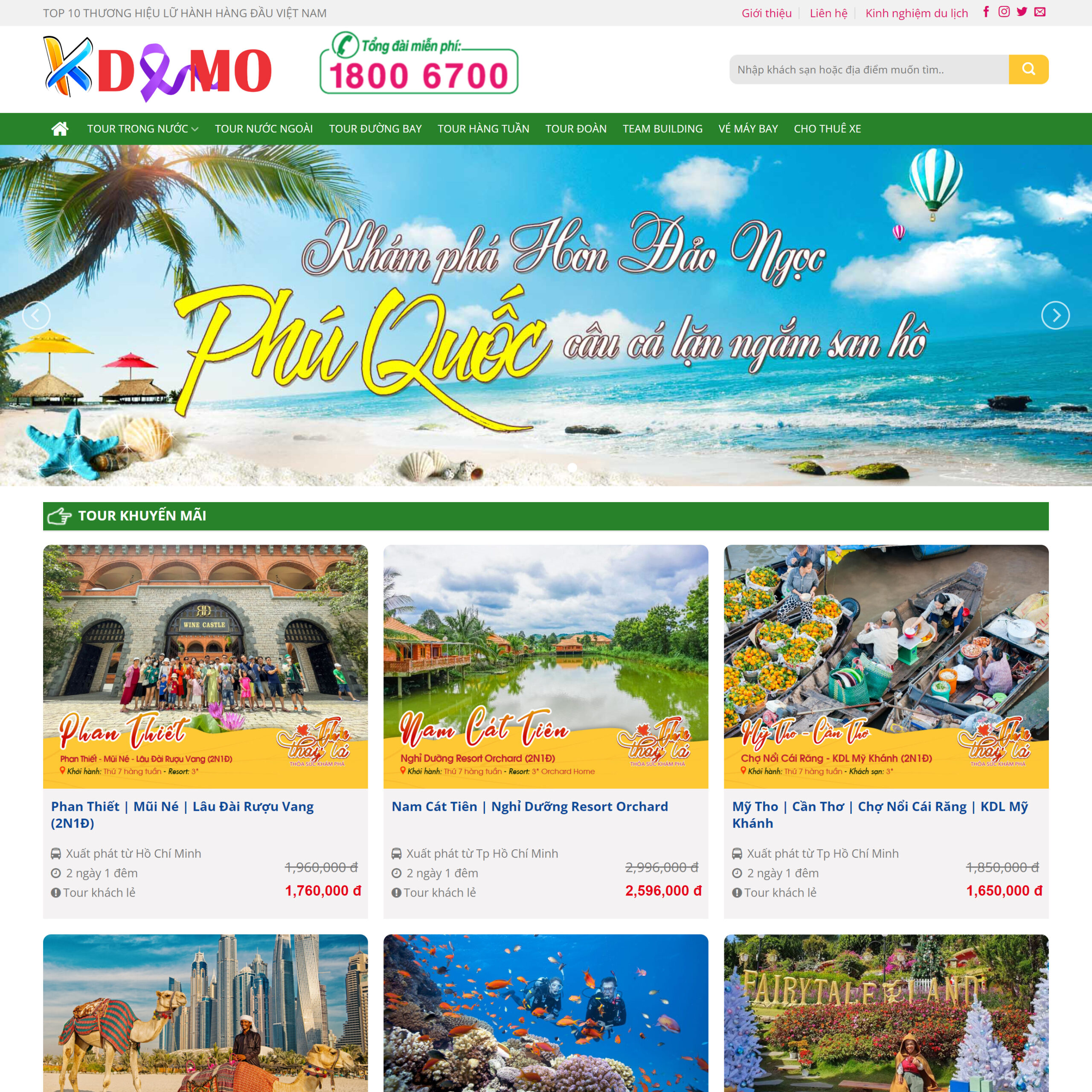 - Thiết kế ấn tượng, độc đáo: Giao diện được thiết kế với phong cách hiện đại, sử dụng hình ảnh du lịch chất lượng cao, kết hợp với màu sắc tươi sáng và bố cục độc đáo, tạo cảm giác chuyên nghiệp, khác biệt và thu hút khách hàng.